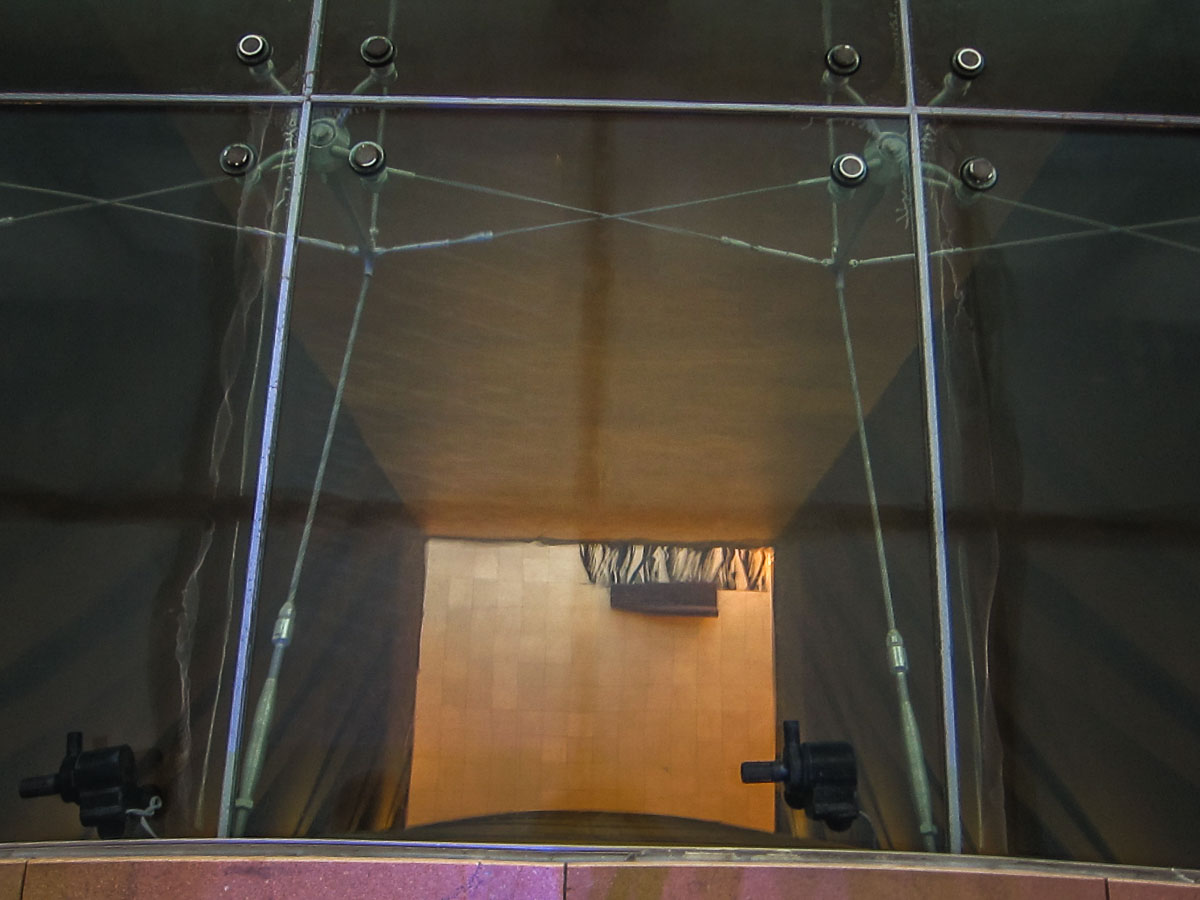 One of the coolest things was this glass-topped atrium that soars through the whole building, topped with a water filled pool that shimmers, warping the people walking in the lobby, stories below.