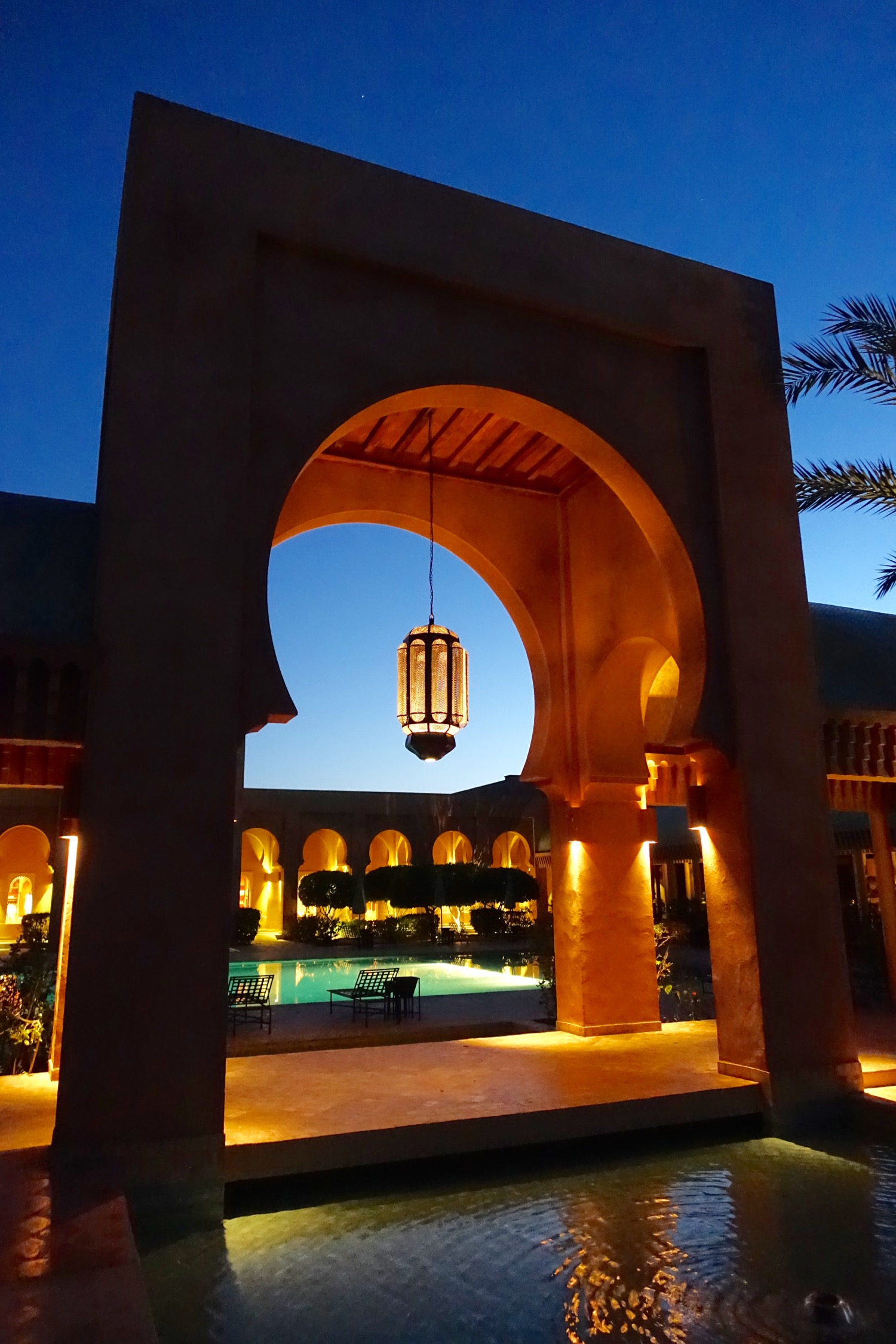 The moon came up, adding its face to the hundreds of lights flickering in the huge lagoon…what seemed like an acre of flat, navy blue blue water. A mirror to the magic that was happening. This is the Amanjena in Marrakesh. And the peaceful groove is ever present throughout the whole resort.