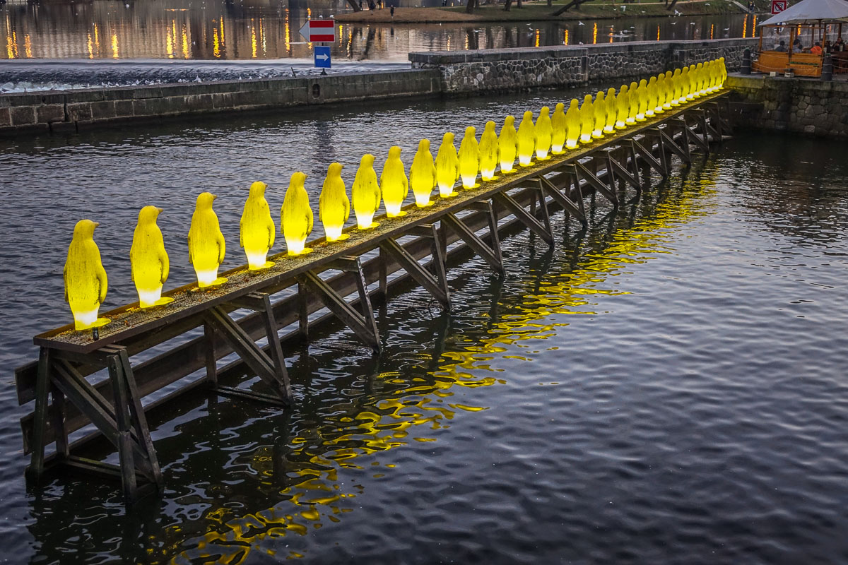 I love the yellow penguins. Just stumbled upon this art installation along the riverfront in Kampa Park, by the Cracking Art Group. They’re made of recycled plastic, as a statement. Sure, you can see them during the day, but at Blue Hour they really pop.