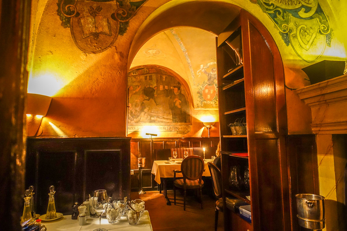 It was the ceiling that got me. Okay, dozens of candles too. Surely, it was the tray going by with silver sauce bowls and big red goblets of wine. Yep, this was just the ticket. In jeans, walking boots and a little dew on the lily from the walk, I didn’t realize I’d walked into one of the top restaurants in Prague. The expression on their face told me so. Kinda like “Seriously?” (but with a thicker accent, obvs.) “Ano, prosím!”
