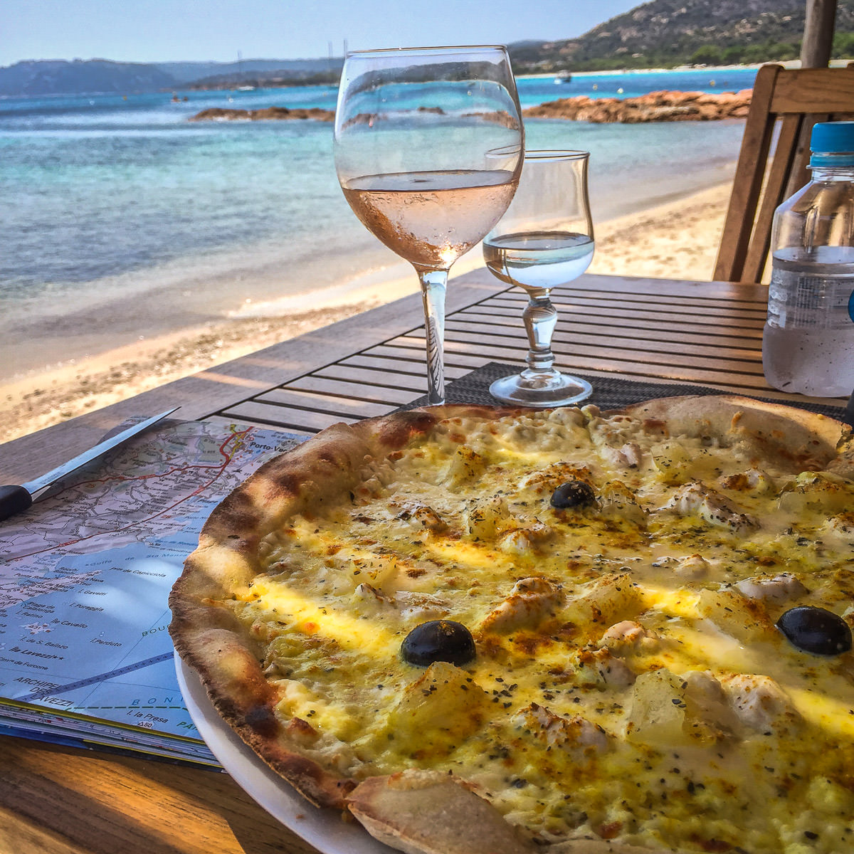 Palombaggia‘s big bay was the most popular, all sorts of everything going on here. Windsurfing. Parasailing. Snorkeling. Boating. SUP. Kayaking. The whole broad bay is lined with restaurants and beach clubs and places catering to your sports rental needs. Lovely pizza stop here.