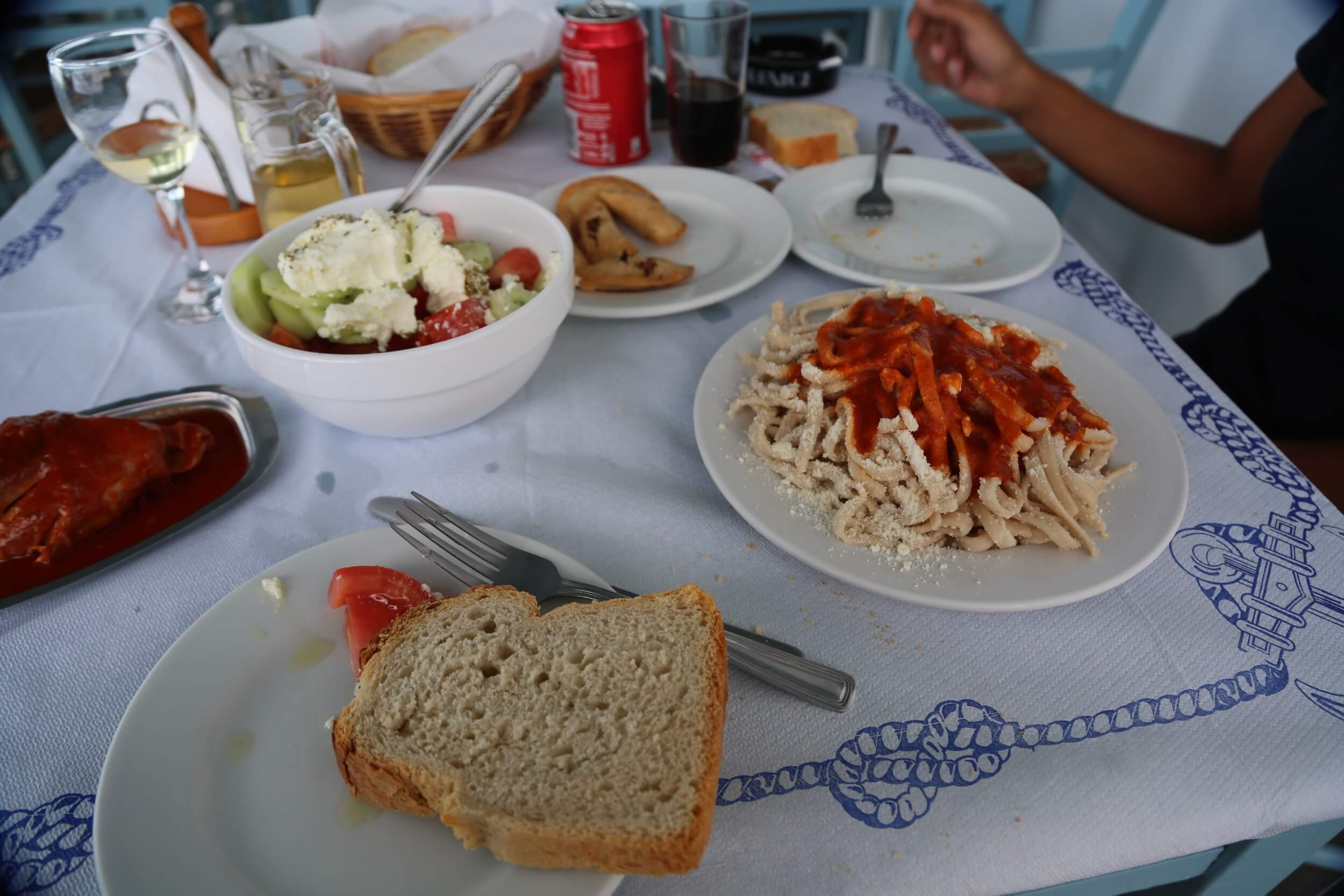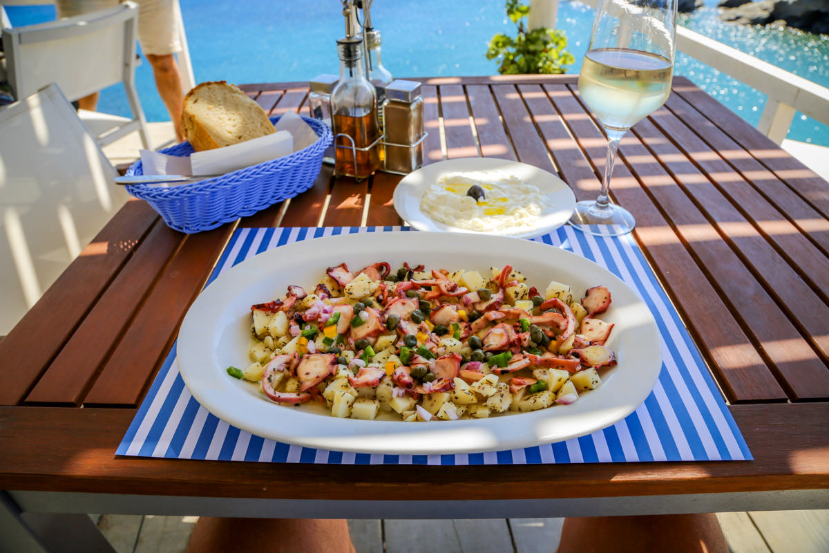 Good lord this was good. Grilled octopus salad with peppers, potatoes, onyuns and some tsatzik from the gods’ goats. You can only get there (and the beach) by hiking over the mountain ridge from Agali Beach or by boat.