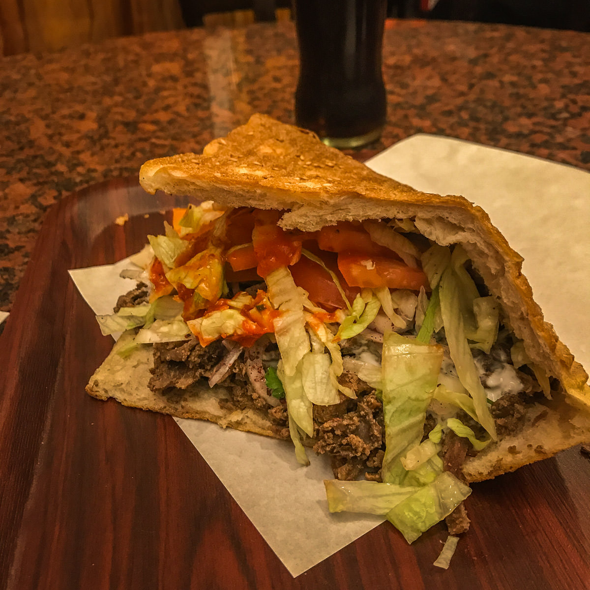 Doner kebab, also spelled as döner kebab, is a Turkish dish made of halal meat cooked on a vertical rotisserie. Seasoned meat stacked in the shape of an inverted cone is turned slowly on the rotisserie. You can find it everywhere in Berlin, at all times of day. It’s almost the National Dish of Berlin. I had an excellent one at Imren Grill in Kreuzberg on Christmas Day — it was one of the only things opened. I loved it.