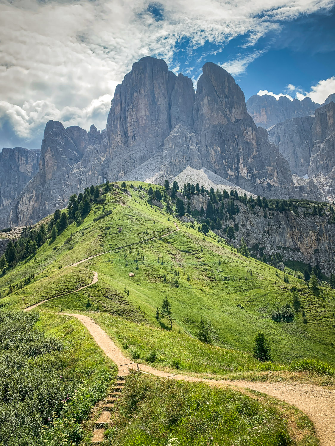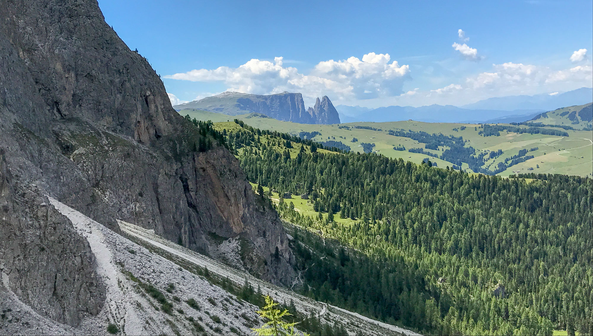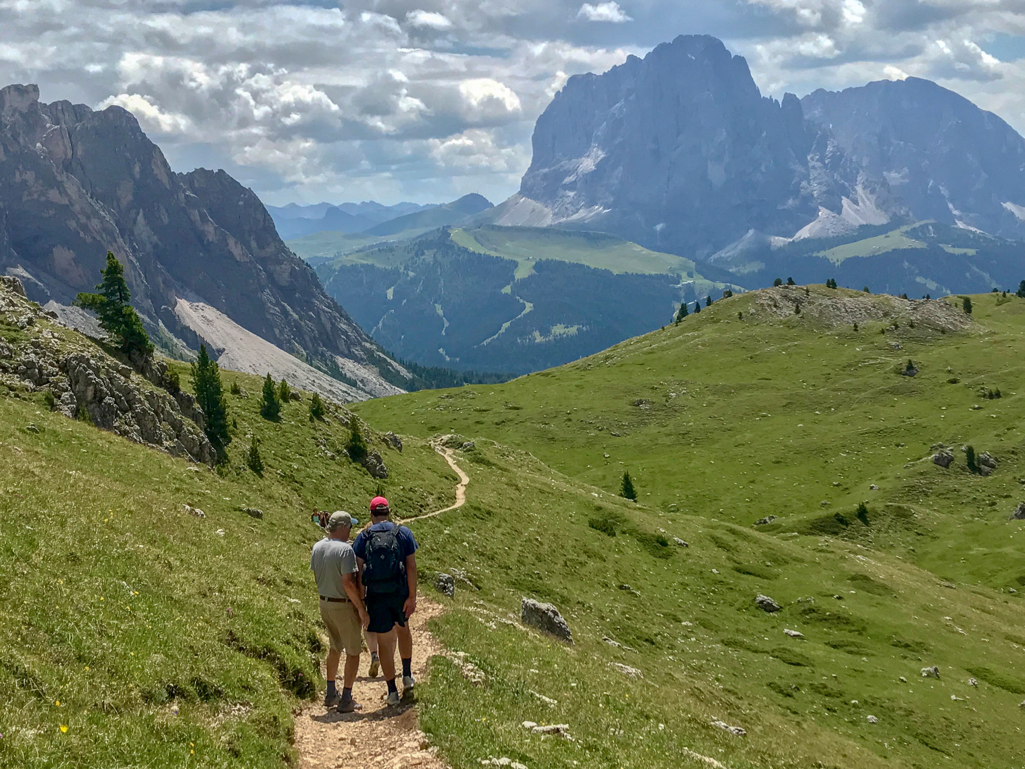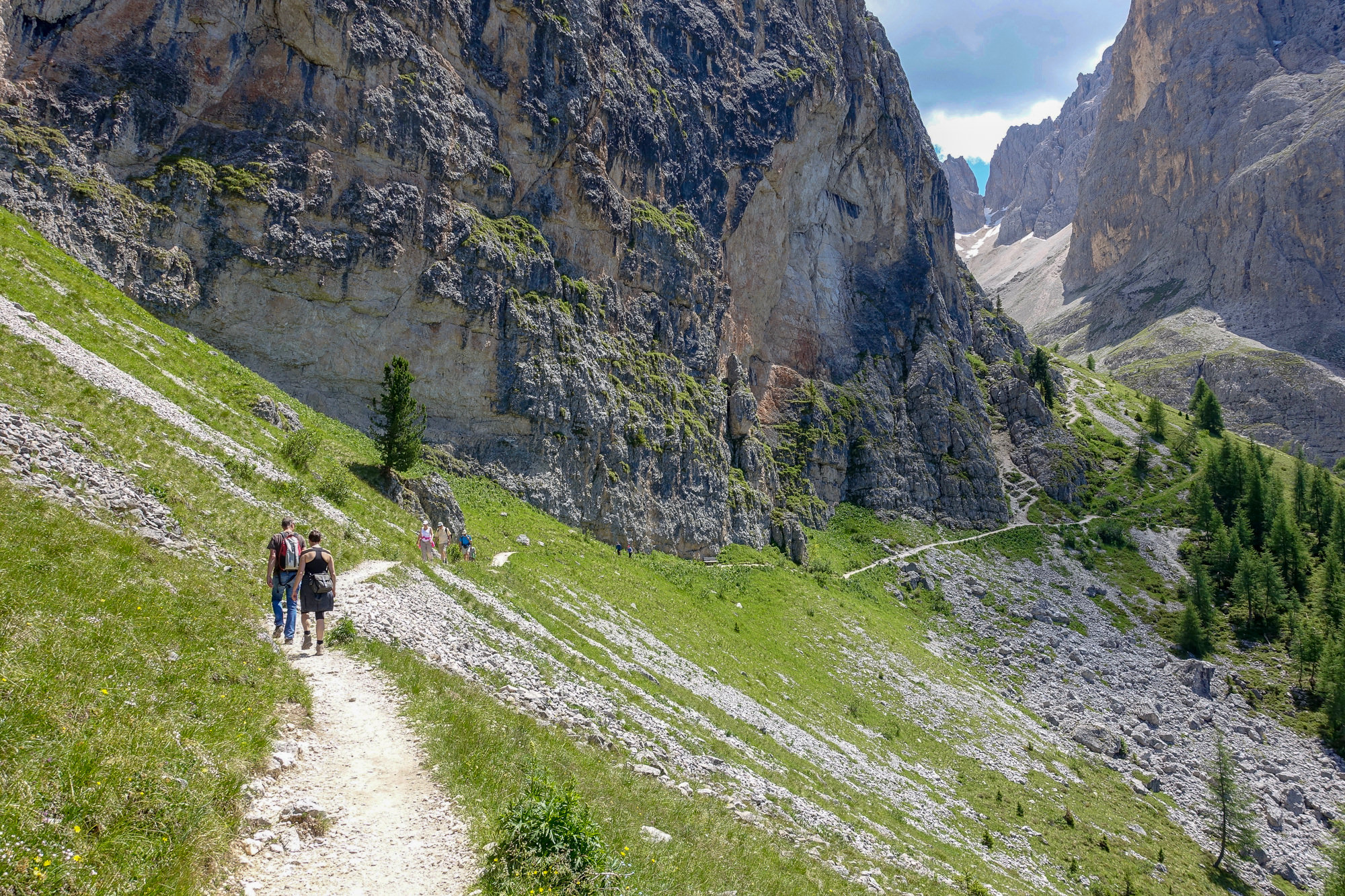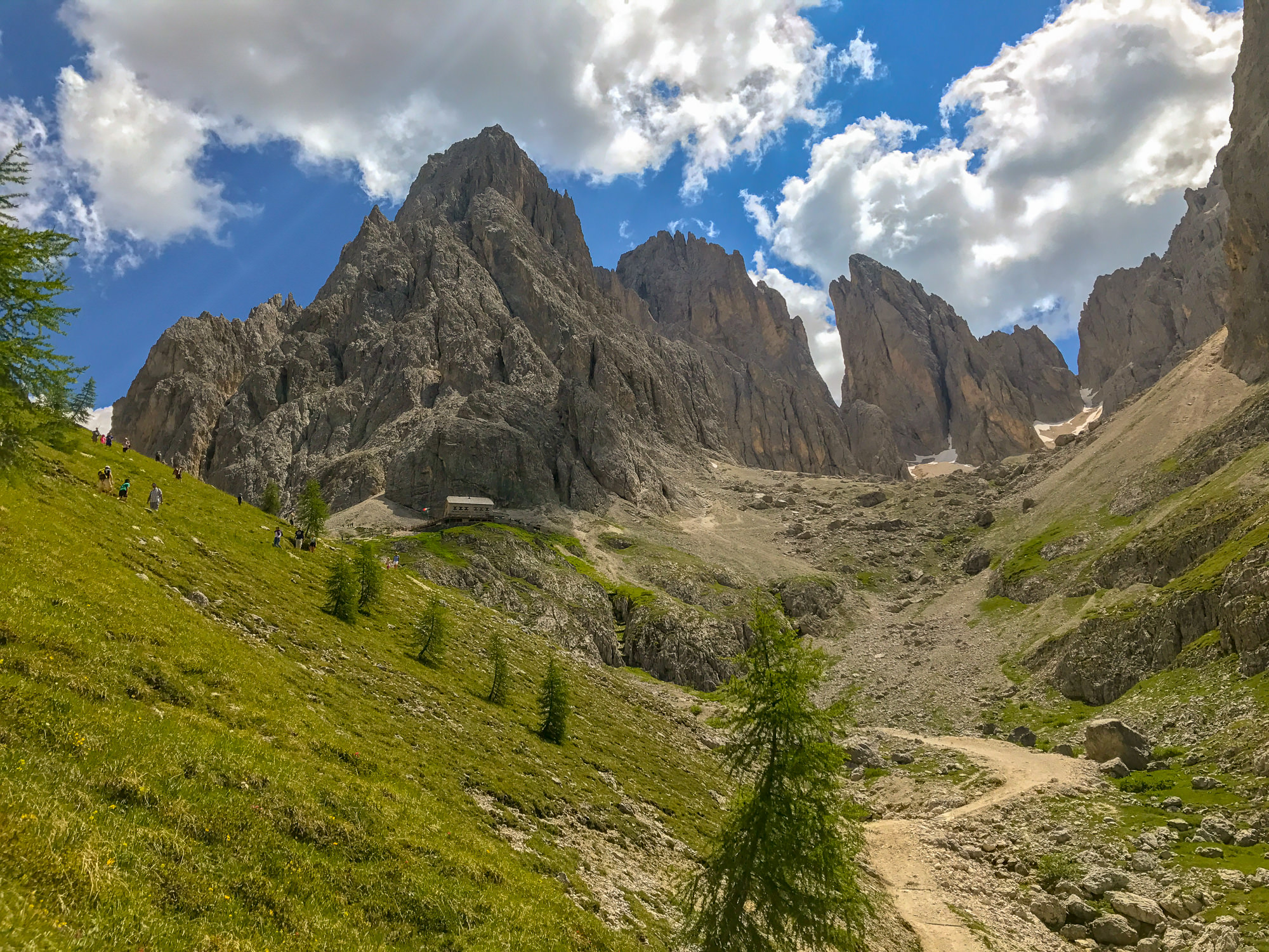 After lunch and a rest, you’re on your way down to the base of Sassolungo, which sits like a big upside tooth in the middle of the valley. The trail circles the base, with views of the deceptively massive Sella Massif wall across the valley.
