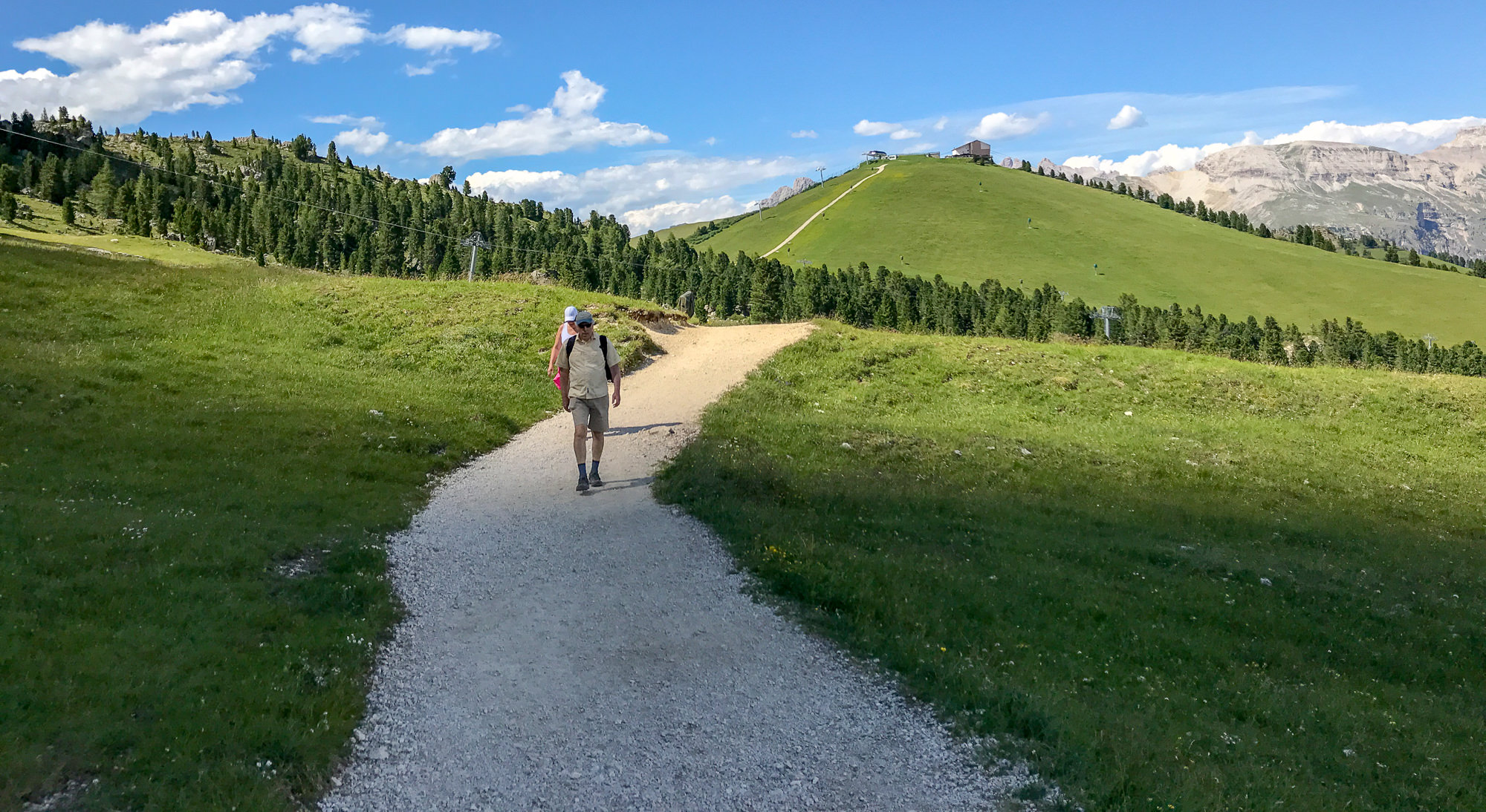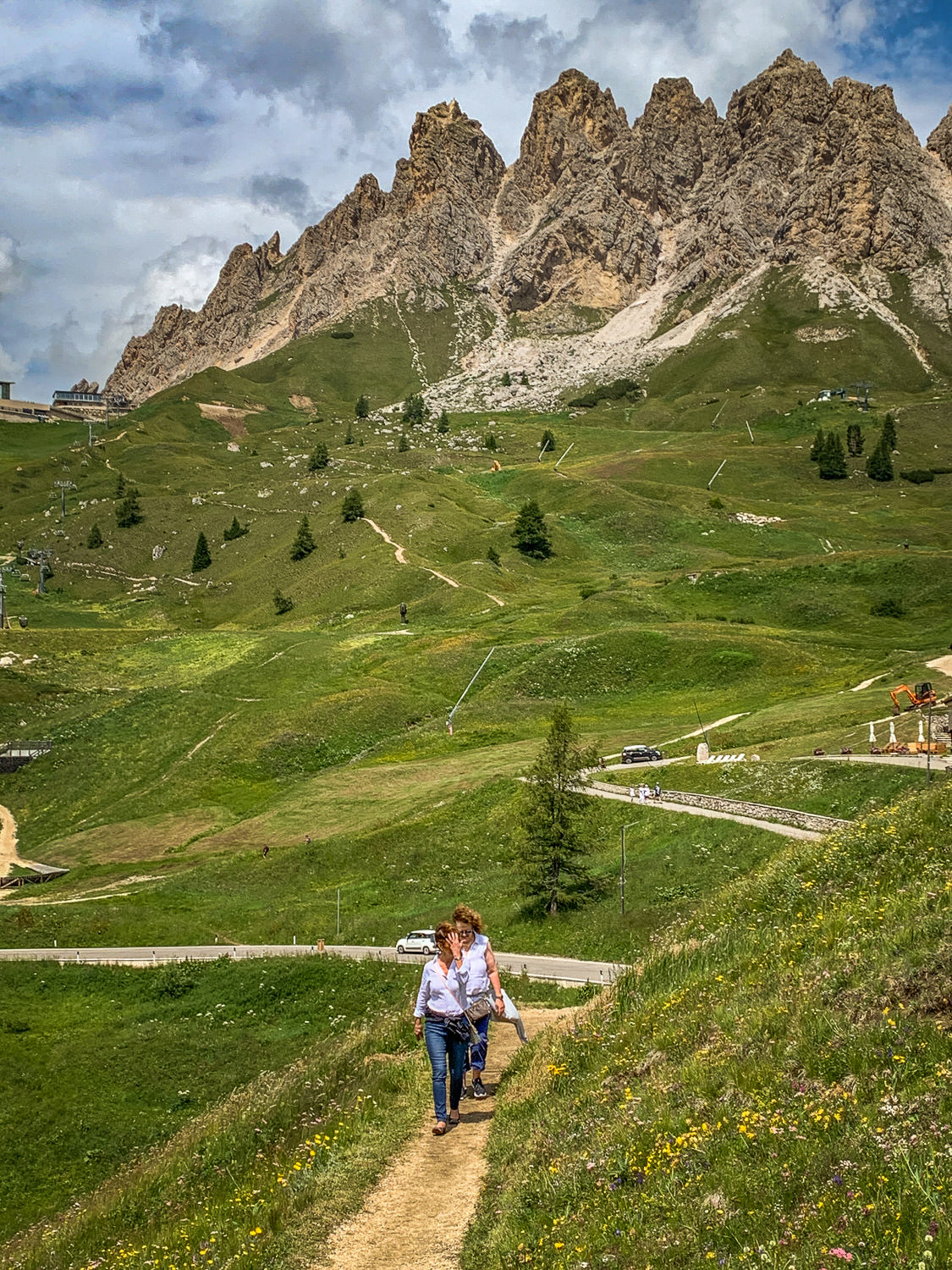 But all that is worth it once you get out and climb up ten minutes onto the trails above the pass. View for miles into Val Gardena, and into Colfosco and Corvara and Val Badia the other direction.