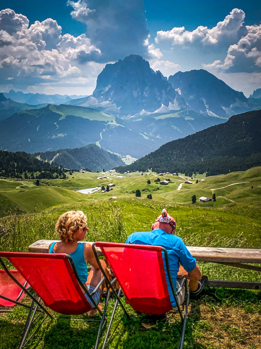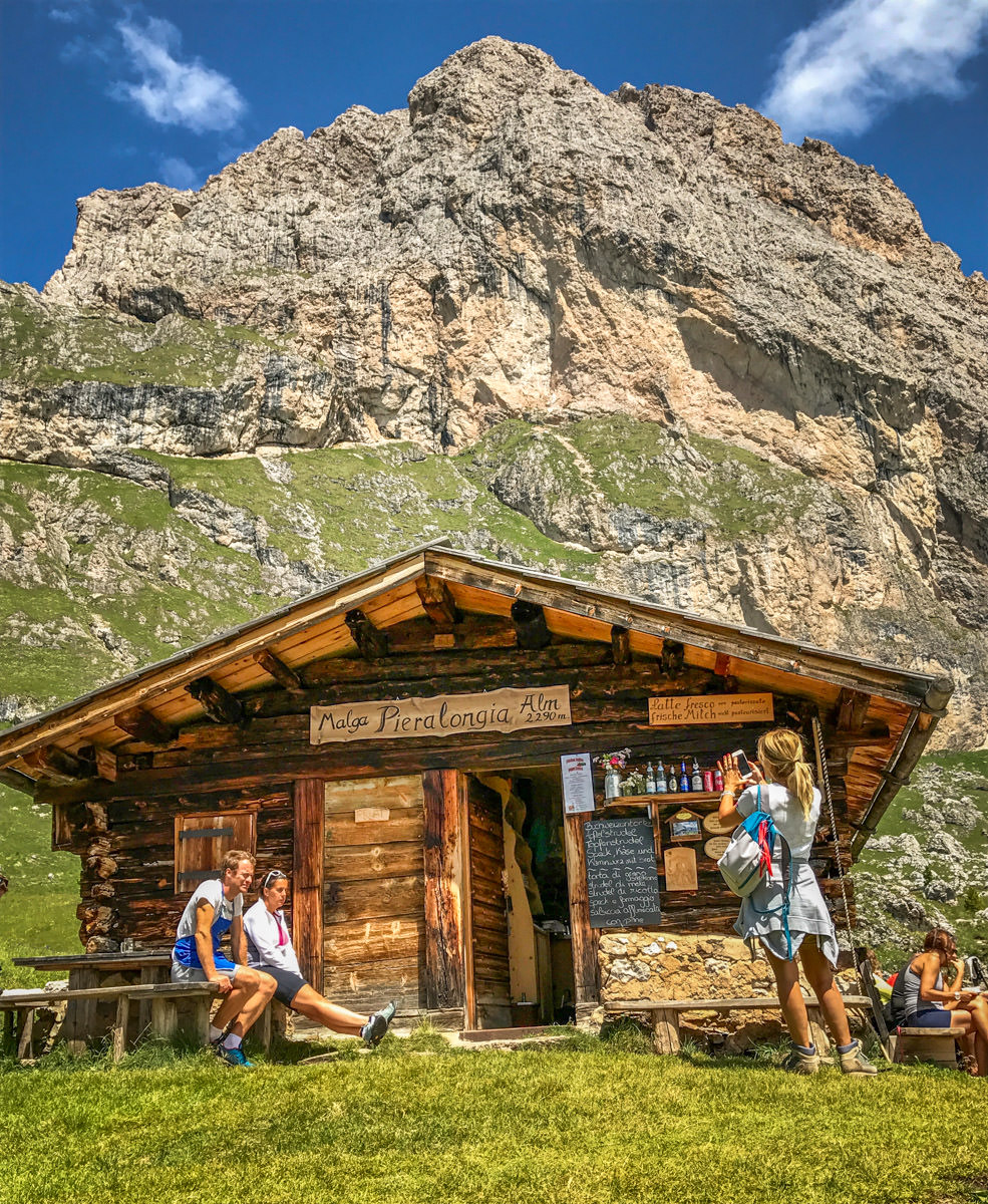 Each day you just head out and decide how far, how long and how hard you want to go. Family-run “huts” called rifugios — really, cabin-like restaurants — are all along the way.  Perfectly spaced out about half-hour or hour apart from each other, serving panini or polenta with porcini, with a spicy red Lagrein to wash it down and a doppio espresso to propel you to the next happy hütte. Proper bathrooms and toilet paper in each hut provide confidence and comfort along the way.