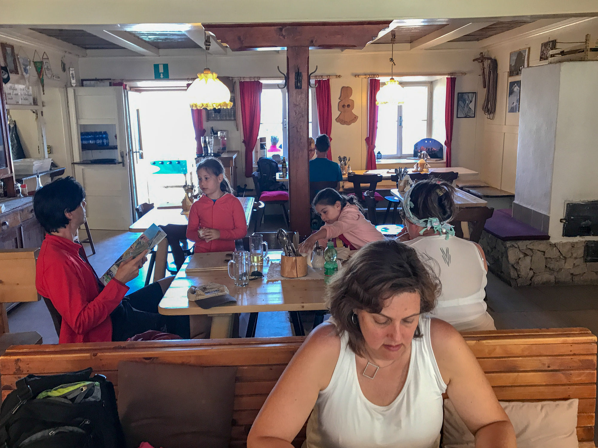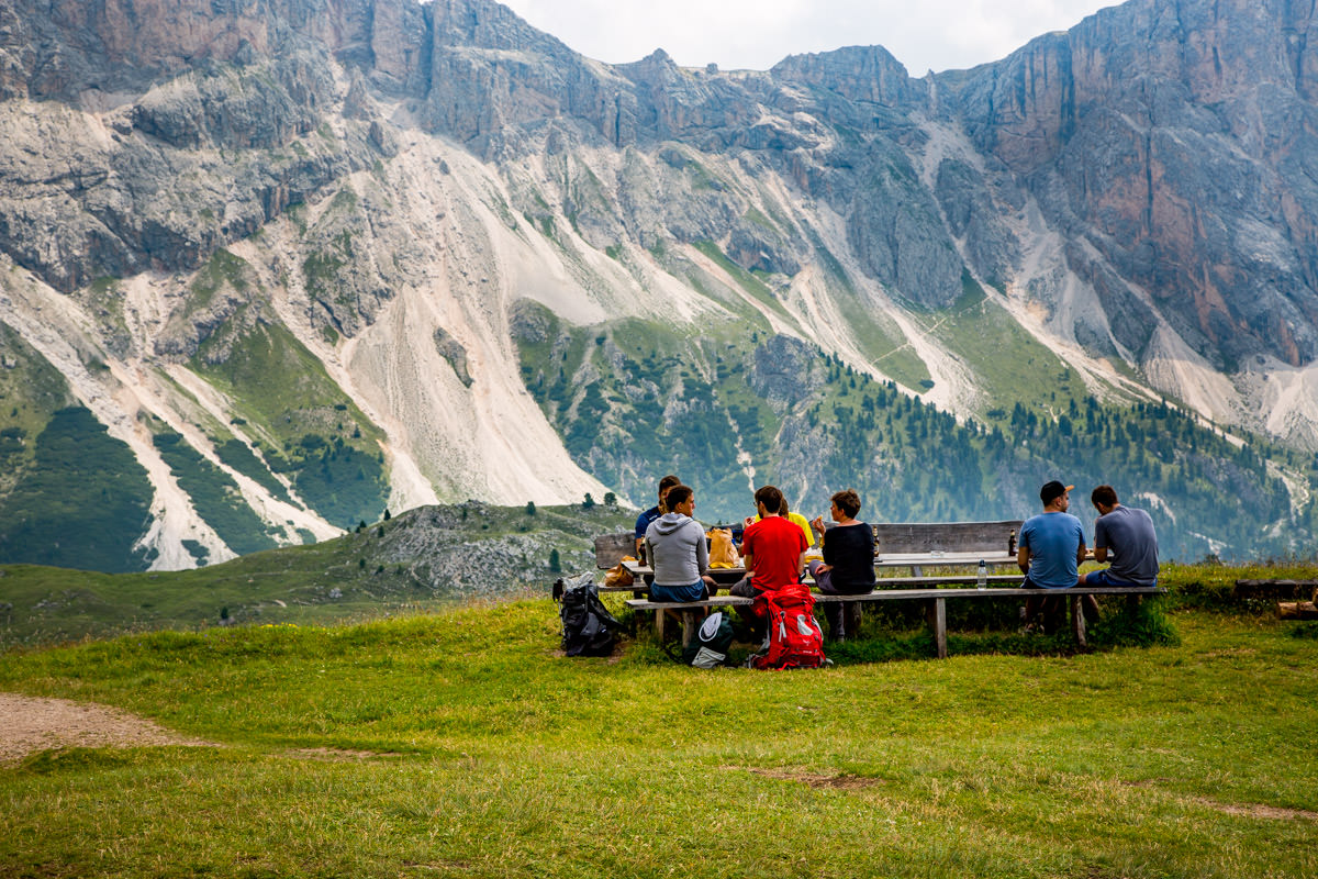 Everyone hanging out on a mountain top, having a nice cold beer, some polenta and local mushrooms and a doppio macchiato to encourage the next three hours of hiking.