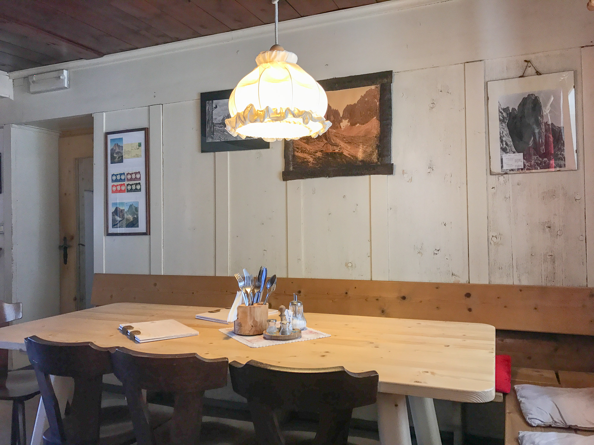The perfect place to put a restaurant. It takes about an hour to get down from the top to Rifugio Vicenza, steep and scree the whole way. But when you arrive, it’s about as cool as it gets. With a big deck and seating inside.