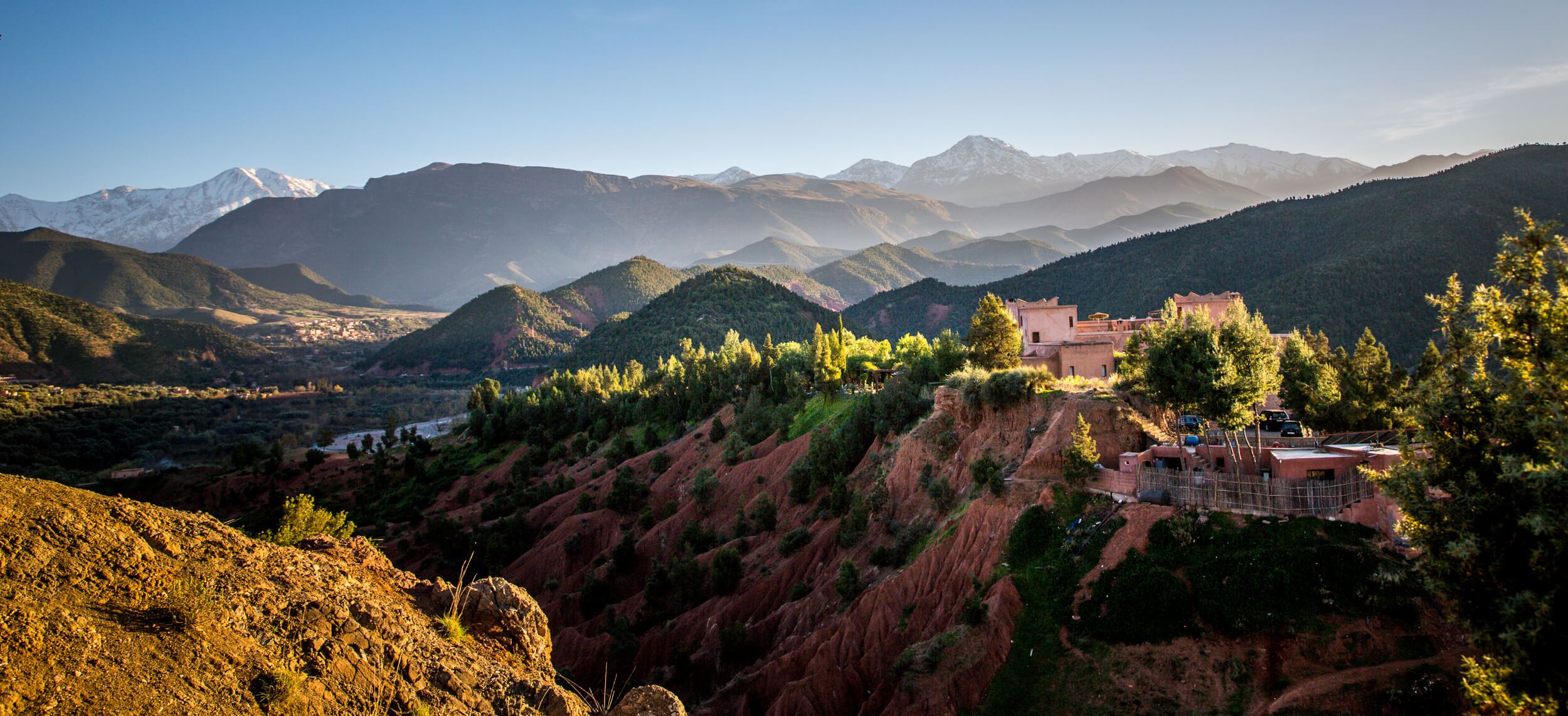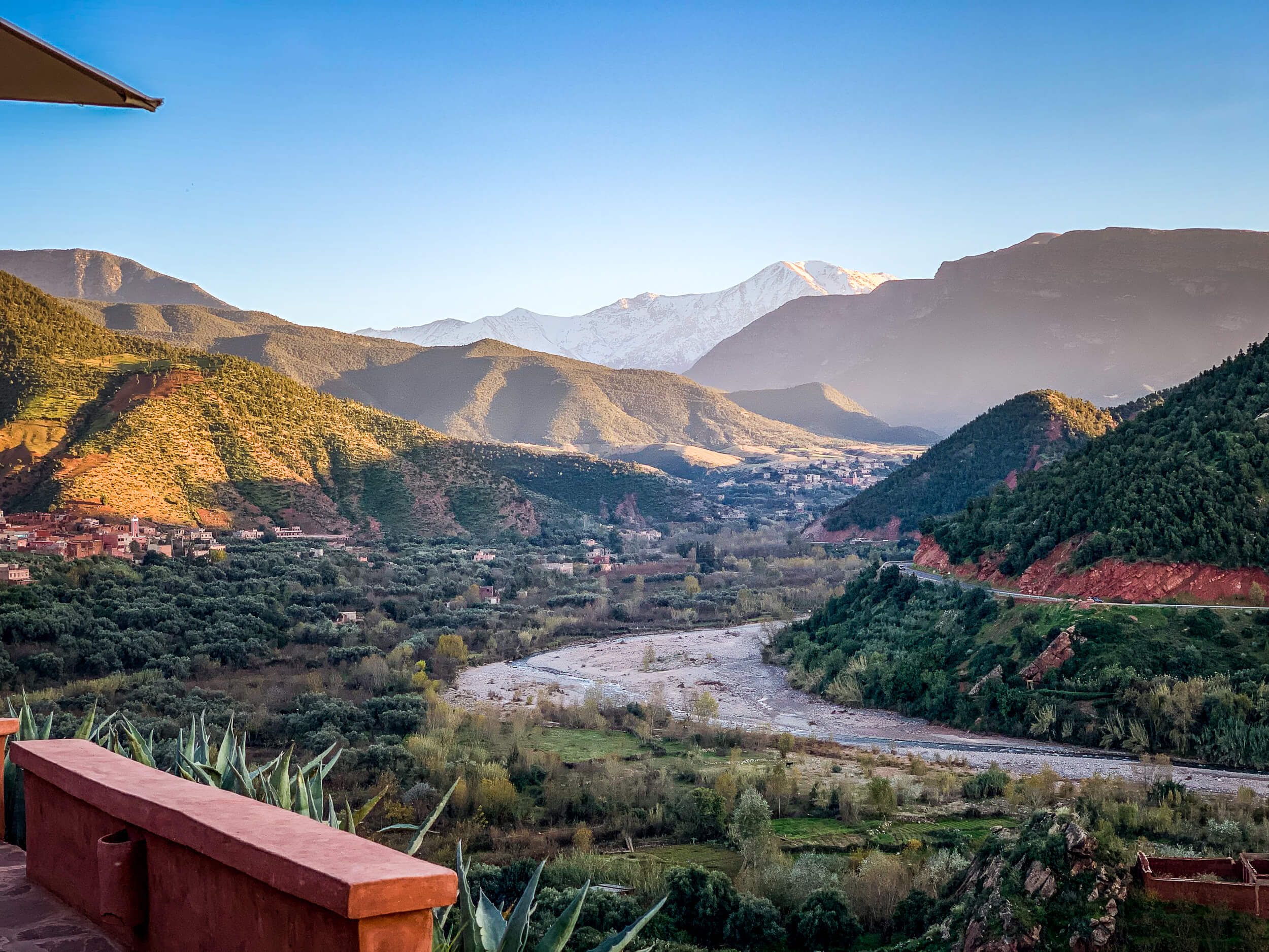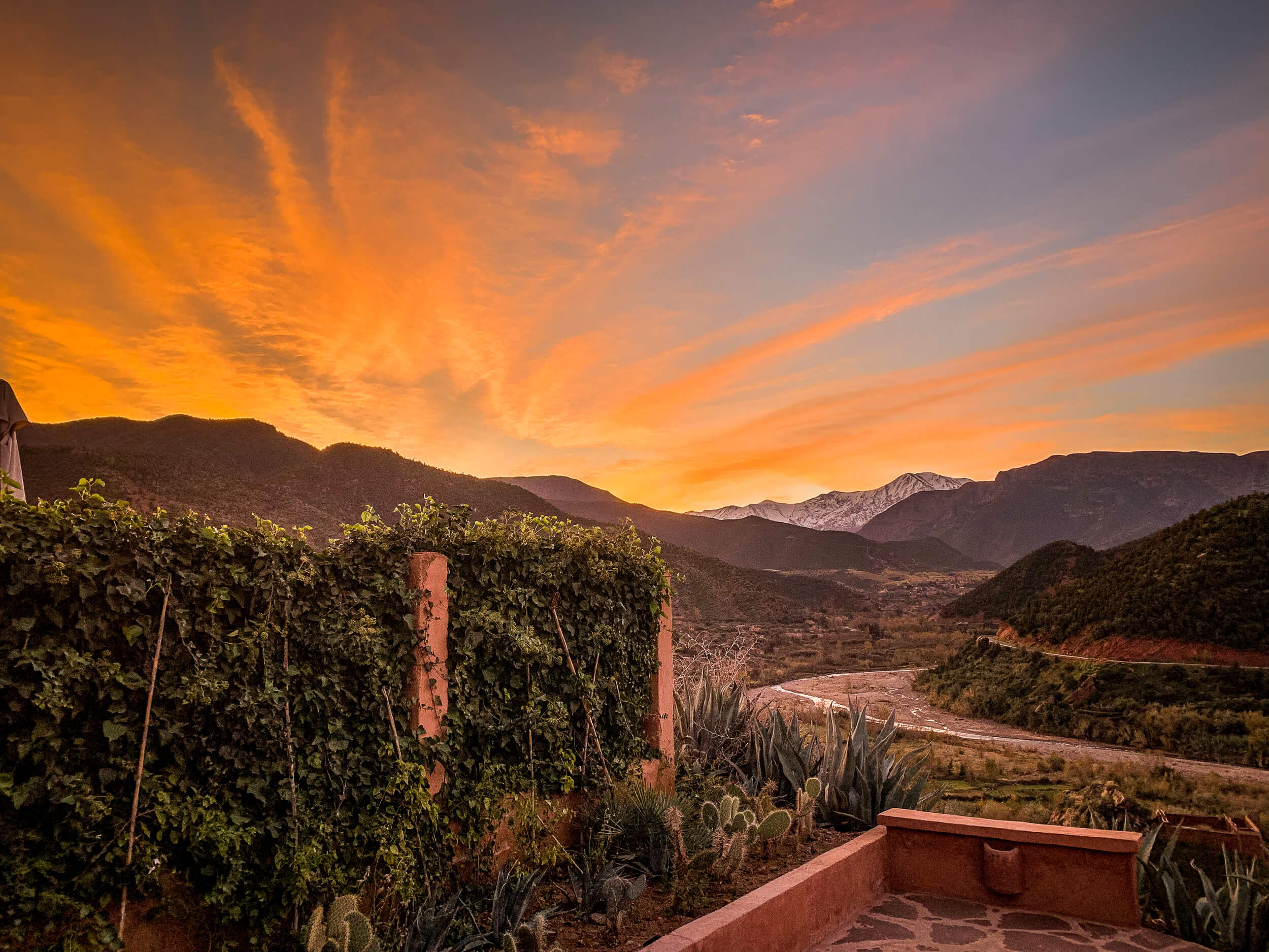 Kasbah Bab Ourika in the Atlas Mountains of Morocco is about as good as it gets. Perfectly perched on a high red rock butte, it has views for miles down multiple valleys. I wondered what the weather would be like over Christmas, but it was just perfect. Warm and sunny by day, cool and fireplace weather at night. With hikes and waterfalls to visit.