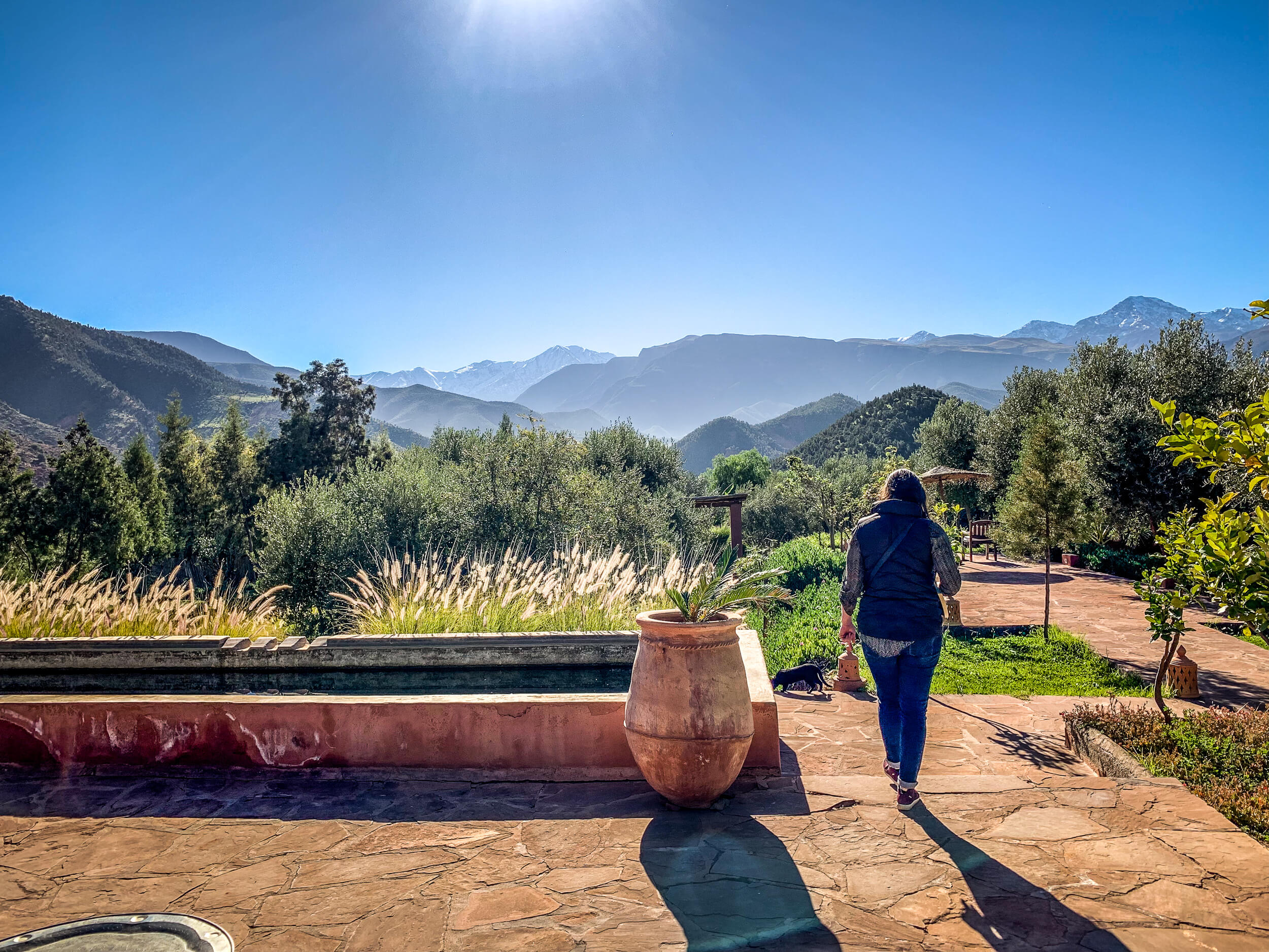 We arrived early in the day — it’s only an hour from Marrakesh — knowing that our room would probably not be ready, but knew that we could hang out in the sunny gardens looking at the stunning mountains. We went through the perfunctory check-in, then the smiling man lead us out into the vast gardens the sprawl to edges all around this magnificent ride. And sat. And smiled.