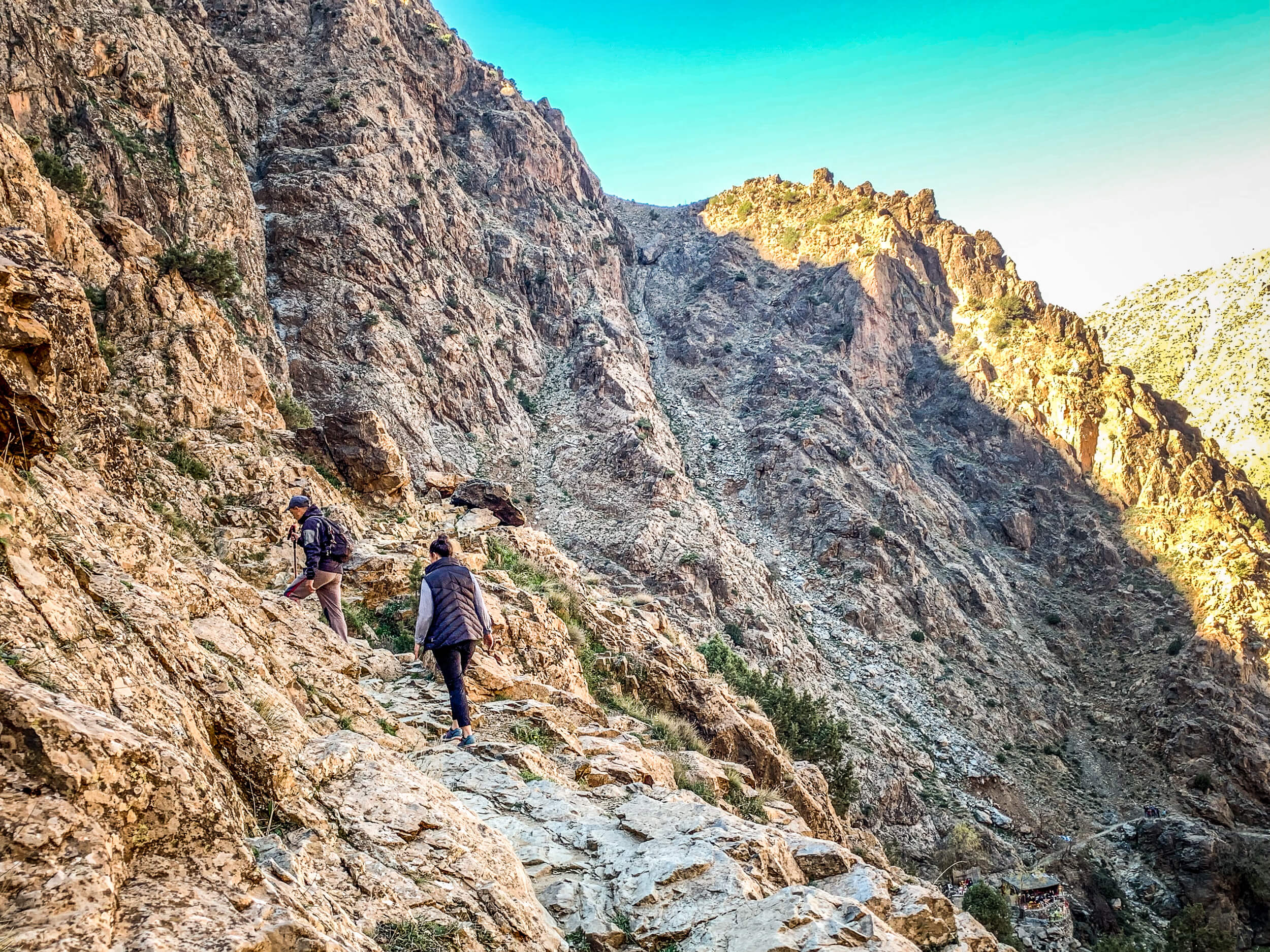 Itchin’ to get up in those glorious hills, we took a guide from the hotel and did a two hour hike up to a series of waterfalls in the High Atlas, near the town of Setti Fatma. The hotel arranged for a driver to take us, meet with a certified climbing guide and who then took us for our hike in the Salt Natural Park. So easy.