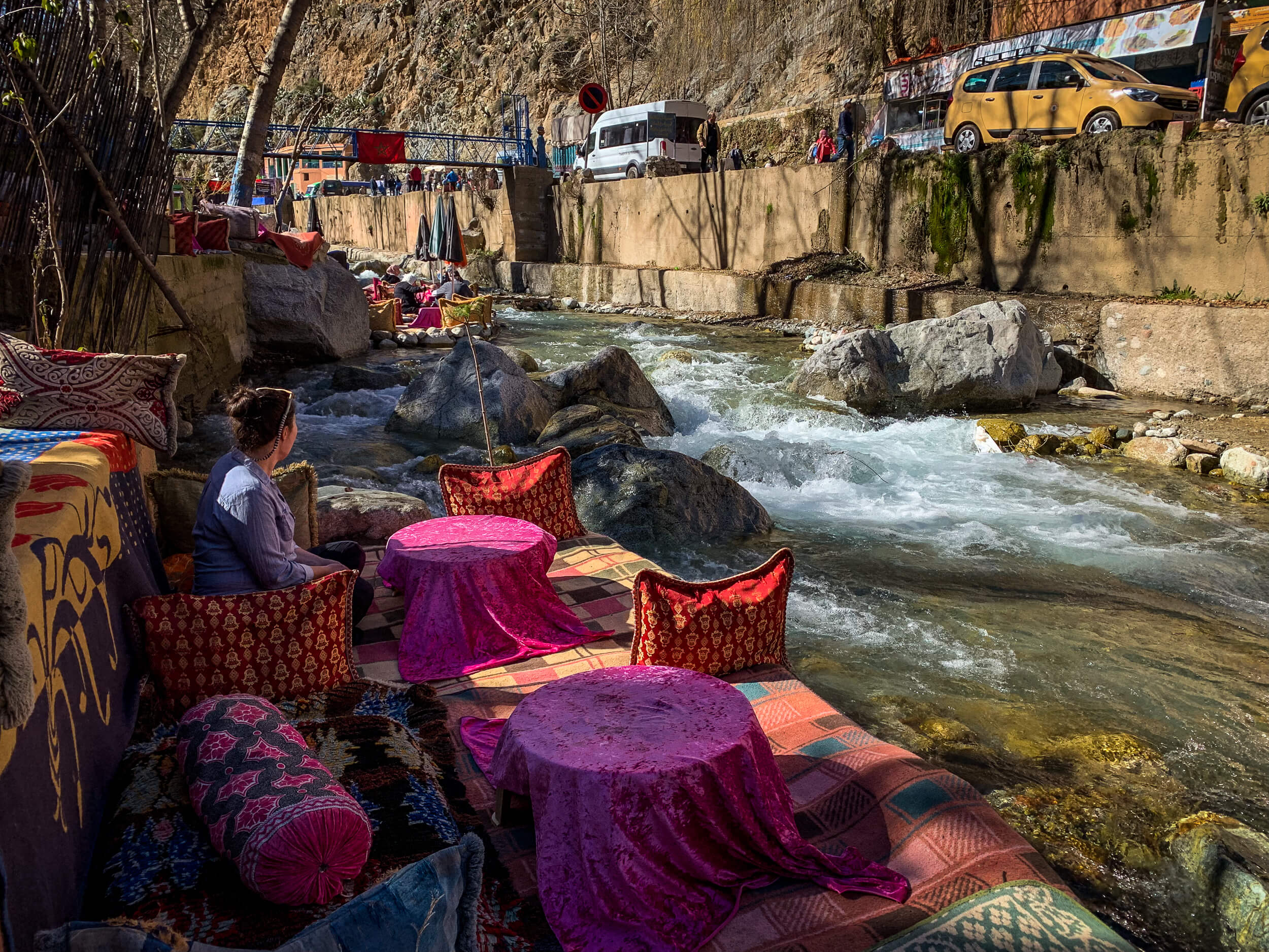 In the summer, when Marrakech reaches 45c, everybody heads up the valley in taxis to cool off for the day, lallygagging by the swirly current, kept awake by this riot of colors. Even on Christmas Eve, the rugs and cafes were choked with people having a good time. All the way down the river, smoke from tagine fires wafting into the cool mountain air.