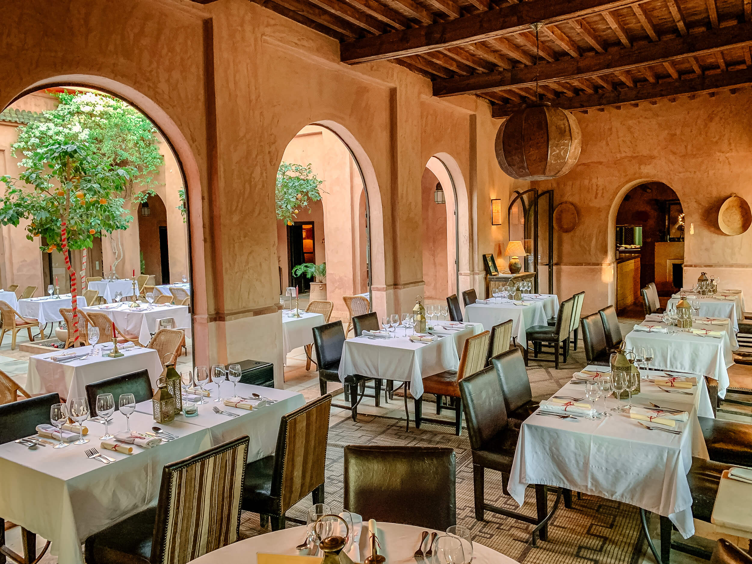 There’s a main restaurant indoors, but lunch and drinks are served on the jaw dropping terrace overlooking the crinkled pink rock formations below. Some days a la carte, other times a buffet. Some people take a taxi out from Marrakesh just for lunch.