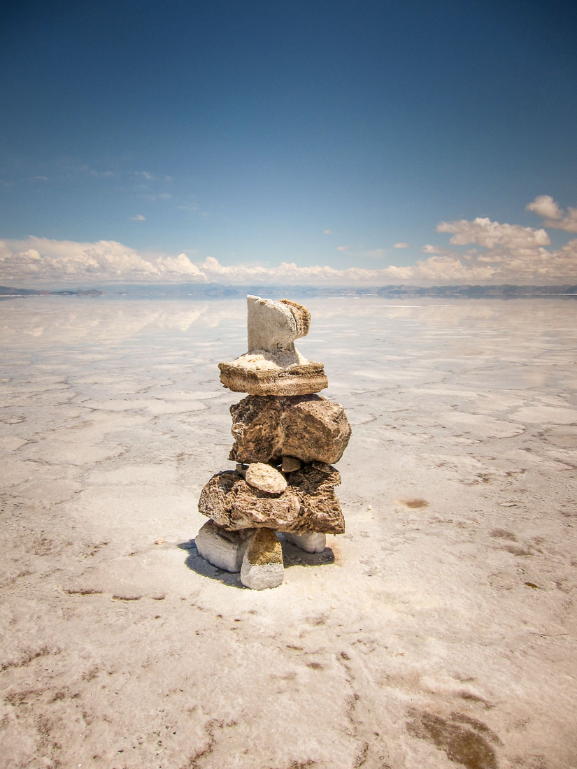 There’s very little rain at this high desert, but in the summer the rains collect and serve as a giant mirror to the sky. In other months it’s a crunchy salt flat — I timed my visit perfectly in March. In summer, it’ll hit 90-100 degrees and in winter, below freezing.