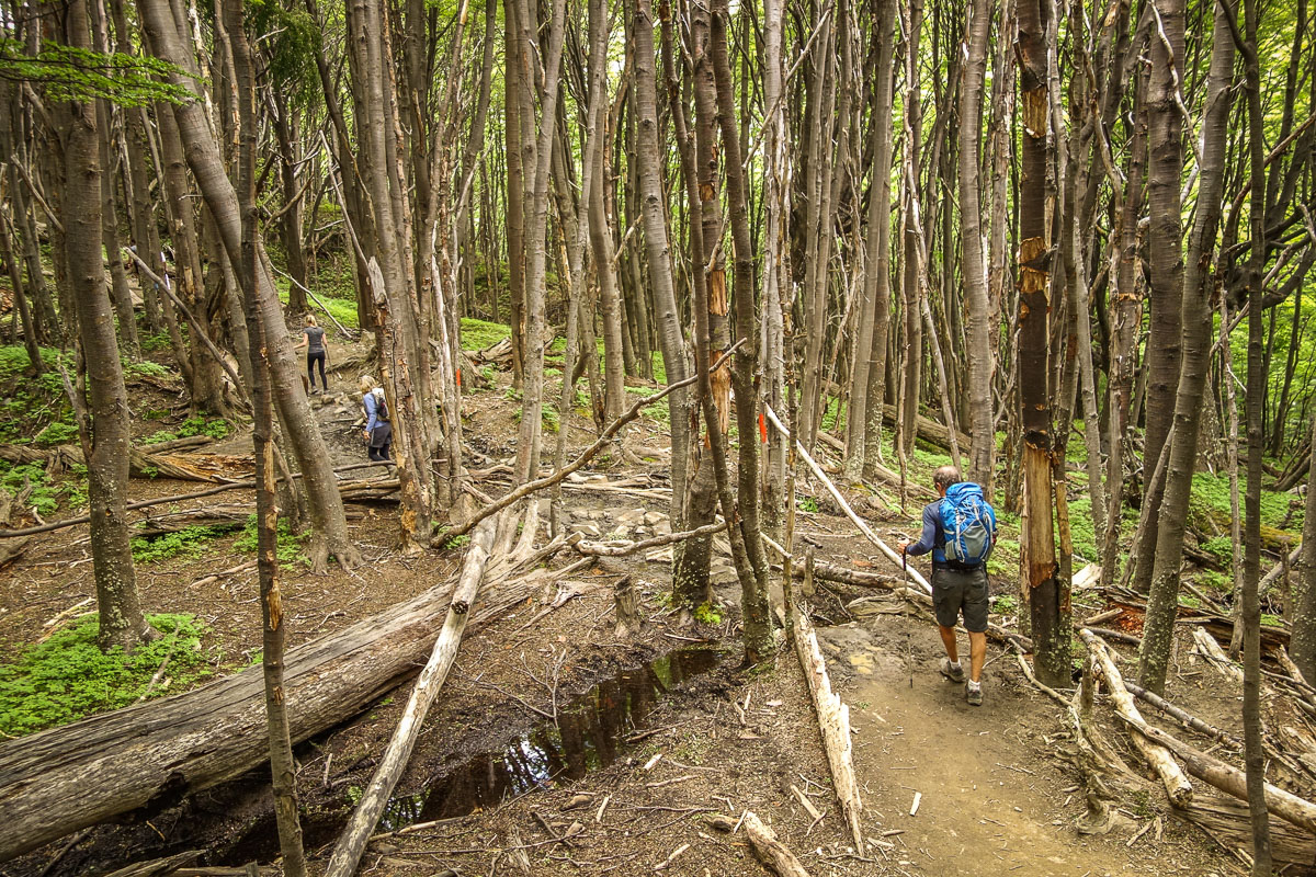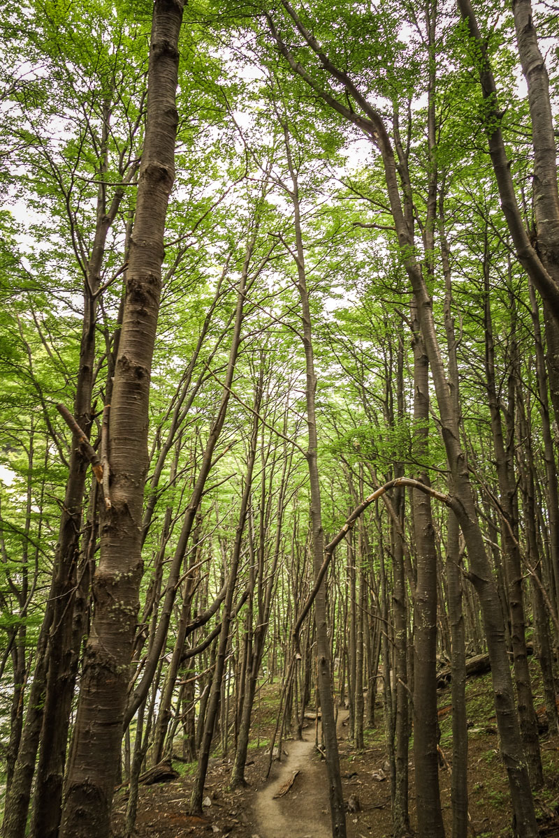 It’s a long, hard hike, a full day of at least seven hours. You start in a rustic hotel parking lot, cross a roaring river on a picture-perfect bridge, then climb through a stunning forest of spiky lenga trees (Patagonia’s iconic beech trees). Lenga trees are very rare, growing in only a very narrow latitude in Chile and Argentina from here to Tierra del Fuego.