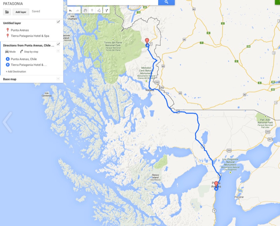 To get there, you fly to Santiago then take another 3 1/2 hour flight down to eerie, end-of-the-world feeling Punta Arenas — a stunning flight straight over the snow-capped Andes, get a window seat on the left — to the bottom of the continent, right above Tierra del Fuego, the place we all studied in grade school.