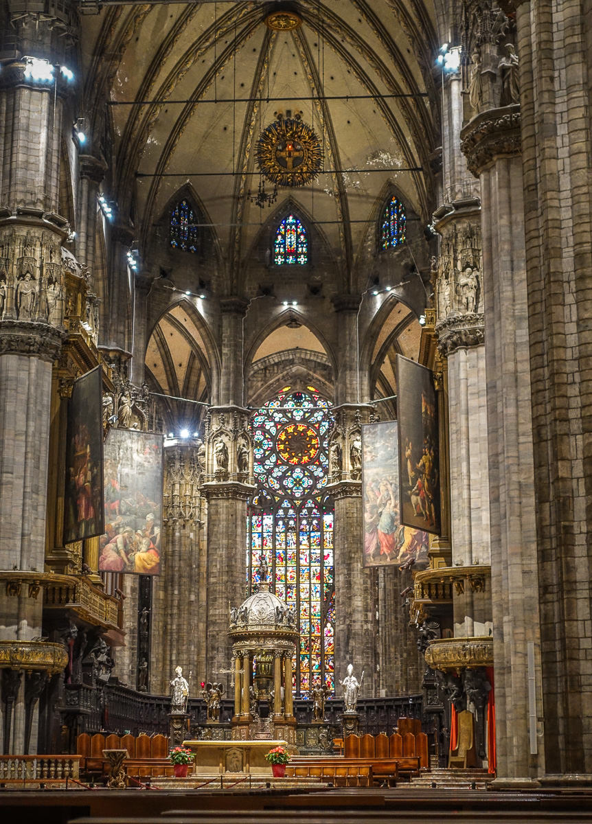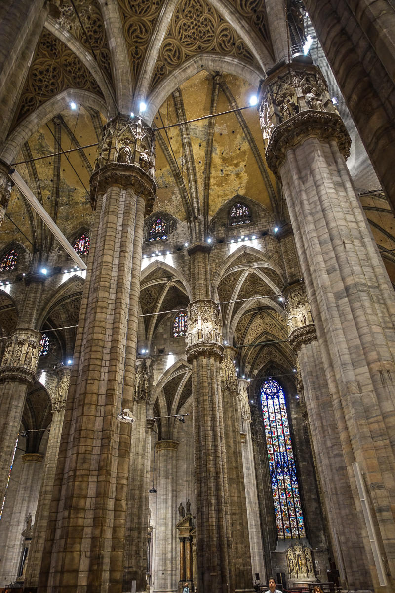 I had no idea what I was in for. I’d seen hundreds of pics of the Duomo in Milan, but nothing prepared me for how amazing it was inside this cool, dark stone forest. More vertical than broad, standing between the columns they look like a pointed laser into the night sky, high into infinity. Check out this stone forest: