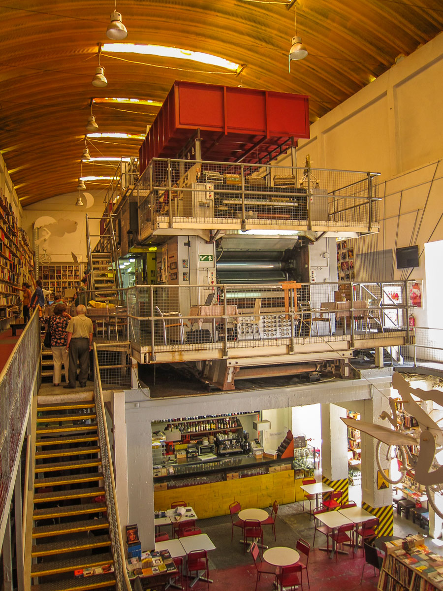 One of the things that drew me to LX Factory was the gorgeous Ler Devagar bookstore in the NYTimes article and in Monocle magazine. This giant room of books is inside an old printing building and actually built around the still-there giant web press.
