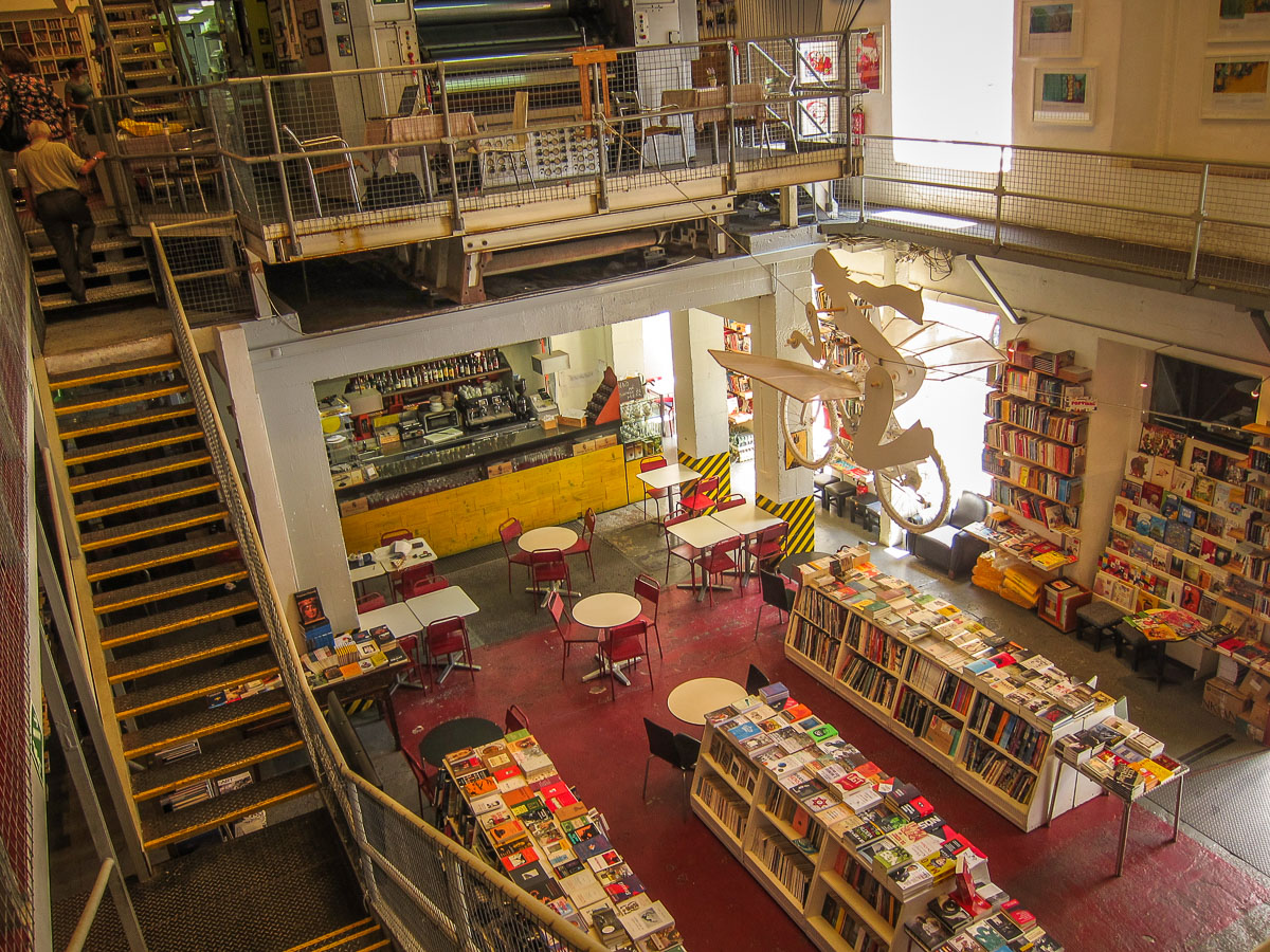 One of my first jobs was marketing Swedish newspaper presses, so I know it probably cost more to remove the press than clean it up and leave it there. But the irony of a bookstore inside a printing plant is rich. There’s even a cool little cafe to snog an espresso and sit on the printing press itself.