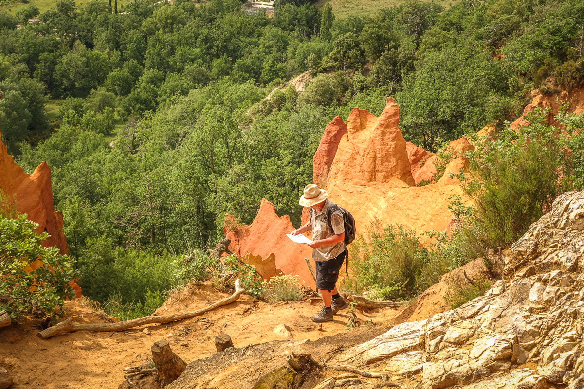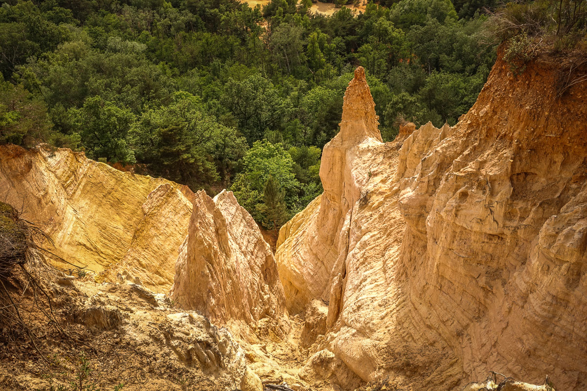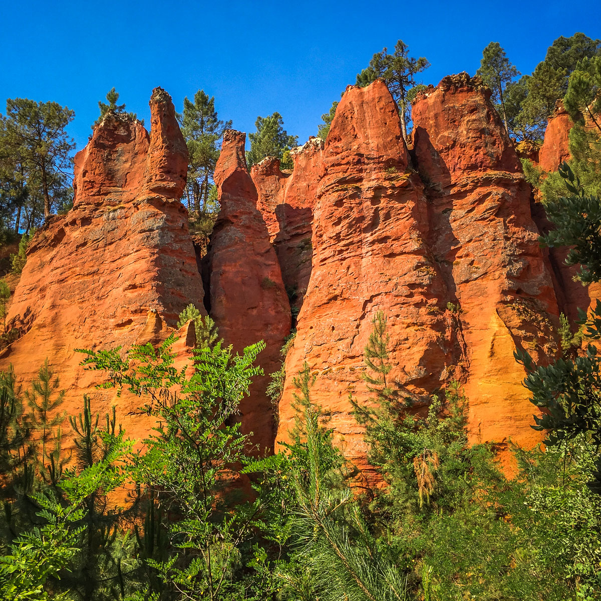 You can’t come to Roussillon without spending most of your time at the jaw-dropping colors of the Sentier des Ocres. Once the ochre mine, with a thread of brightly colored powdering rock and dirt they used for pigments in paintings in the 1800s until the 1930s, when they shut down the mines to preserve this special place. The invisible underground ochre vein pops up again miles away outside Rustrel (see below).