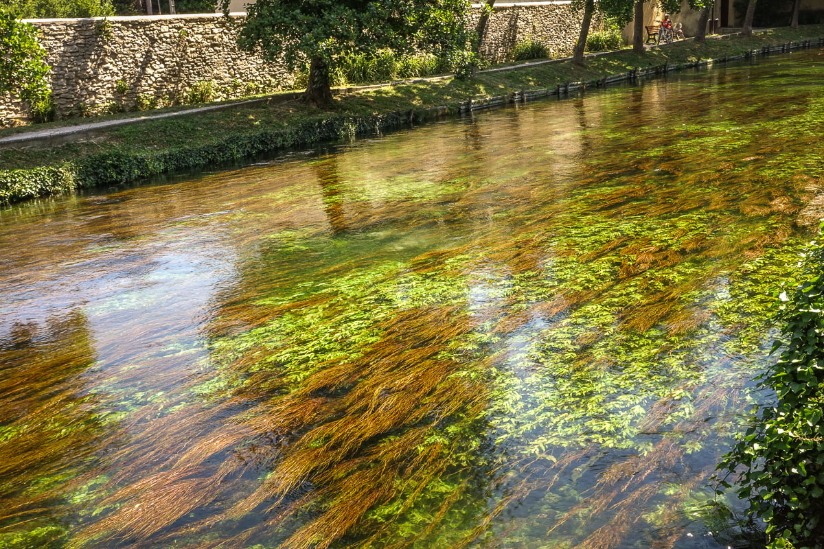 You can follow the famed super clear Sorgue river up to its source, a great maw in the side of a cliff, with Listerine blue spring water emanating from deep inside the cliffs. Fontaine-de-Vaucluse is a bit of a tourist trap in places, but also kinda cool. The green glow from the sun bouncing off the mossy green river is otherworldly. Just follow the people walking up the cafe-lined path to the source of the spring. Then stop at one of the moss-side cafes and cool your heels with a beer or spritz.