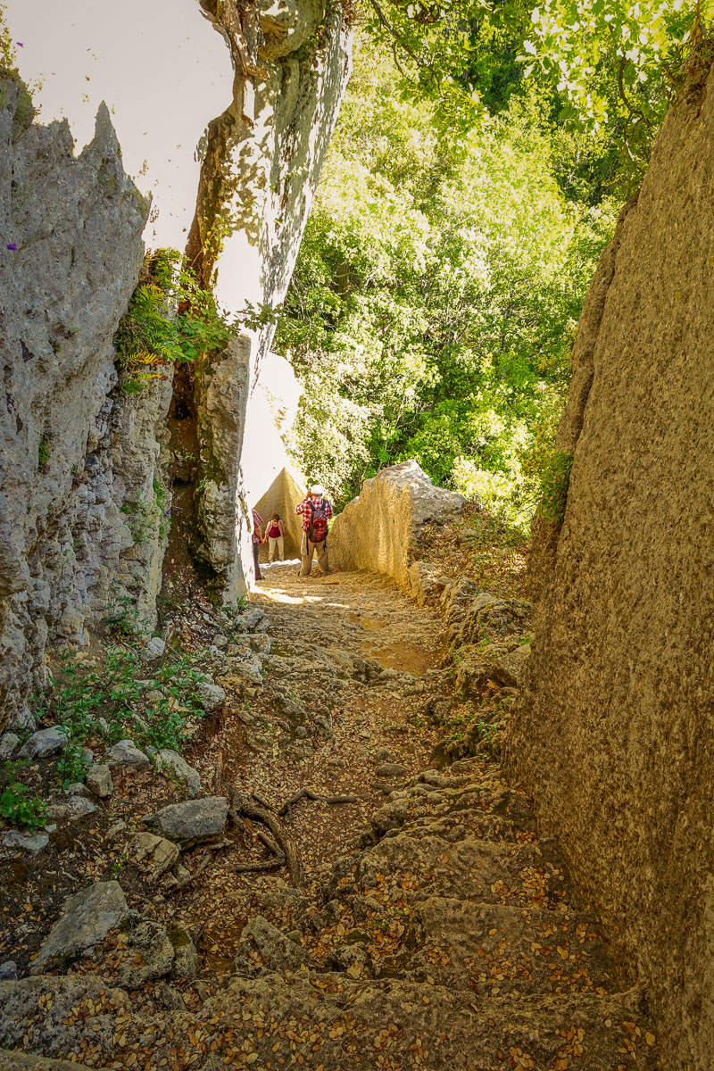 You take a steep trail up and enter at the low end and pass through the stone gate. It was designed such that progressive fortifications allowed the residents to retreat uphill, protected by row after row of thick walls. My favorite part was the coolest hidden escape stairway carved into the rocks, totally invisible from the ground below, allowing people to escape unnoticed.